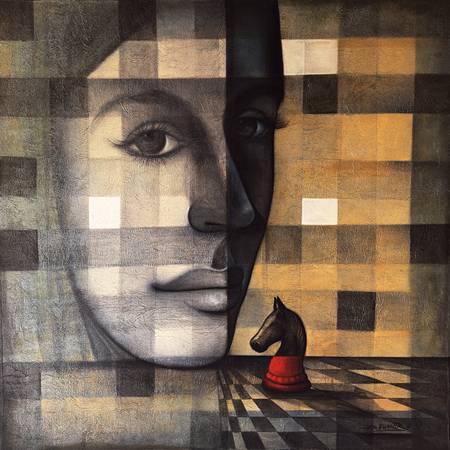 The thematic continuities in his other paintings—such as the juxtaposition of a stag and bottled elements, or a female figure looking upwards to a red triangle—point towards dream logic and symbolic narration. These visual metaphors, grounded in tonal harmony and compositional finesse, suggest cycles of longing, observation, and silent transformation. There is a strong undercurrent of the feminine divine, spiritual ecology, and cosmic alignment running through his visual lexicon.