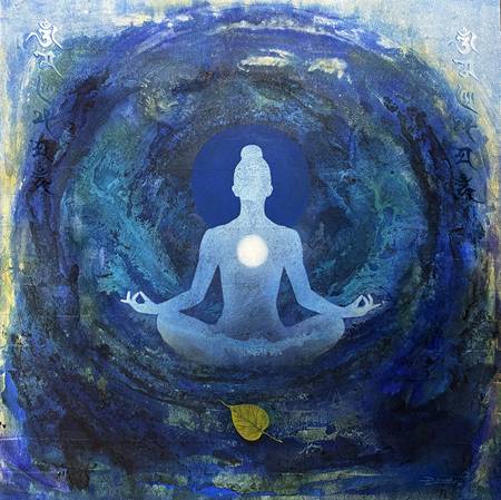 The central figure in meditative posture, rendered in earthy tones and textural overlays, becomes more than a subject—it becomes a metaphor for the eternal rhythm of existence and the serene cadence of spiritual awakening. Parmar’s art invites the viewer into a tranquil realm where silence is audible and time slows into reflection. His use of colour fields and organic textures evokes both natural patterns and inner emotional weather, turning each work into a portal of introspection.